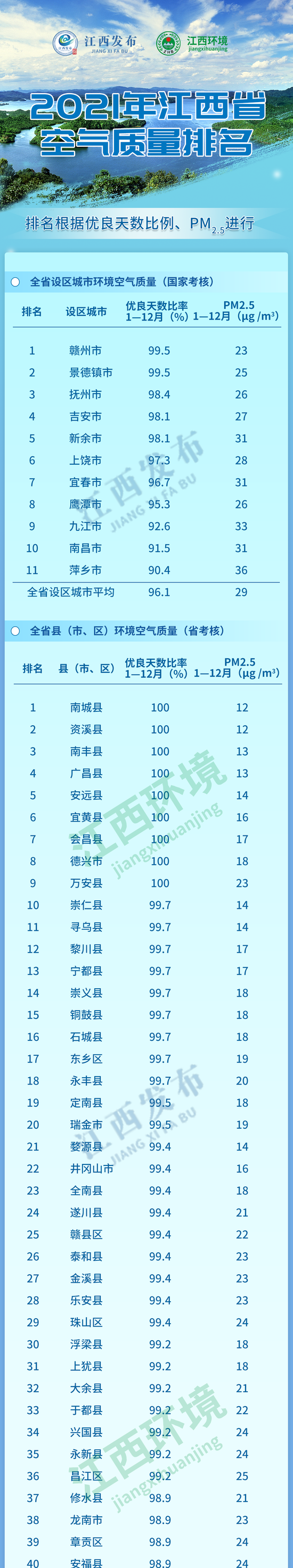 刚刚,江西省2021年空气质量排名和各设区市地表水环境质量排名出炉!快来跟着发布哥一起看看吧!