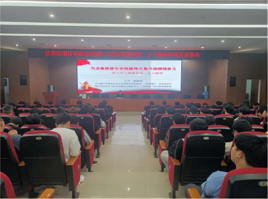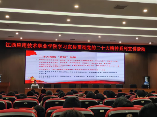 4月26日晚,江西应用技术职业学院马克思主义学院在图书馆学术报告厅举办“为全面推进中华民族伟大复兴而团结奋斗”专题讲座。中共赣州市委党校党史党建教研室副教授、赣州市红色研究会副会长兼秘书长谢昌荣应邀作宣讲报告。马克思主义学院教师代表及机械与电子工程学院学生代表等300余名师生到场聆听,报告会由马克思主义学院副院长何希纯主持。