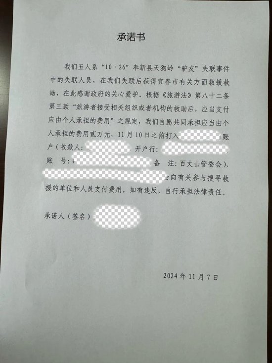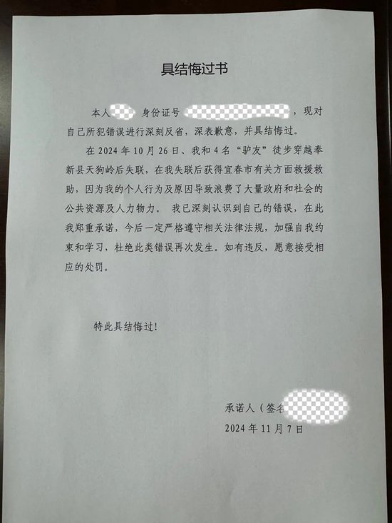 明知不可为而为之,任性“驴友”为自己的鲁莽买单。11月7日,宜春市政府在江西省应急管理厅对5名“驴友”进行了警示教育约谈,会上对“驴友”违反政府管理规定,擅自进入未开发开放区域探险行为进行了严肃的批评教育,并要求其作为完全民事责任人承担相应责任。与会“驴友”表示感谢政府的关心关爱,后悔自己的鲁莽行为,今后不再犯同样的错误,签署了《具结悔过书》。