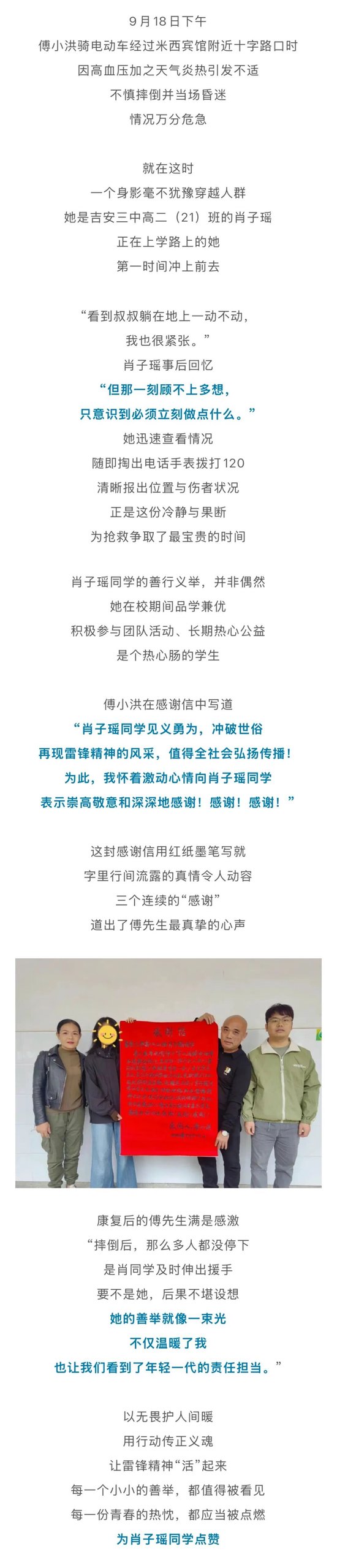 当危机悄然发生,总有人挺身而出!日前一封饱含深情的感谢信送至吉安三中揭开吉安三中高二(21)班的肖子瑶的暖心故事