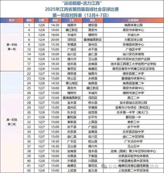 “赣超”之后,江西“县超”又来了。2025年江西省第四届县域社会足球联赛(简称“江西县超”)已经在11月30日开赛。第一阶段(12月4-7日)赛程会在哪些县域打响?看这里。你会为哪支球队加油?