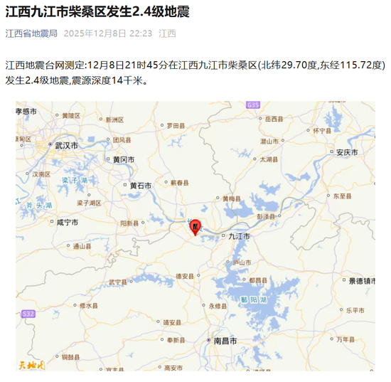 江西地震台网测定:12月8日21时45分在江西九江市柴桑区(北纬29.70度,东经115.72度)发生2.4级地震,震源深度14千米。